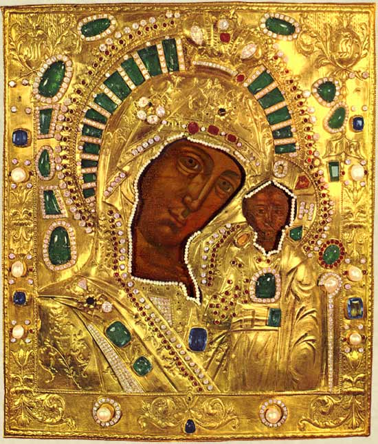 A imagem original, pintada em data incerta, esteve vários séculos no mosteiro de Kazan e dela se fizeram muitas reproduções, em igrejas espalhadas pela Rússia. Despareceu em 1209, nas guerras, e foi recuperada em 1579, nos escombros de um incêndio, em circunstâncias miraculosas. Tornou-se então a referência da Rússia, a salvadora da pátria: primeiro contra os polacos; depois contra os suecos; a seguir contra Napoleão.
